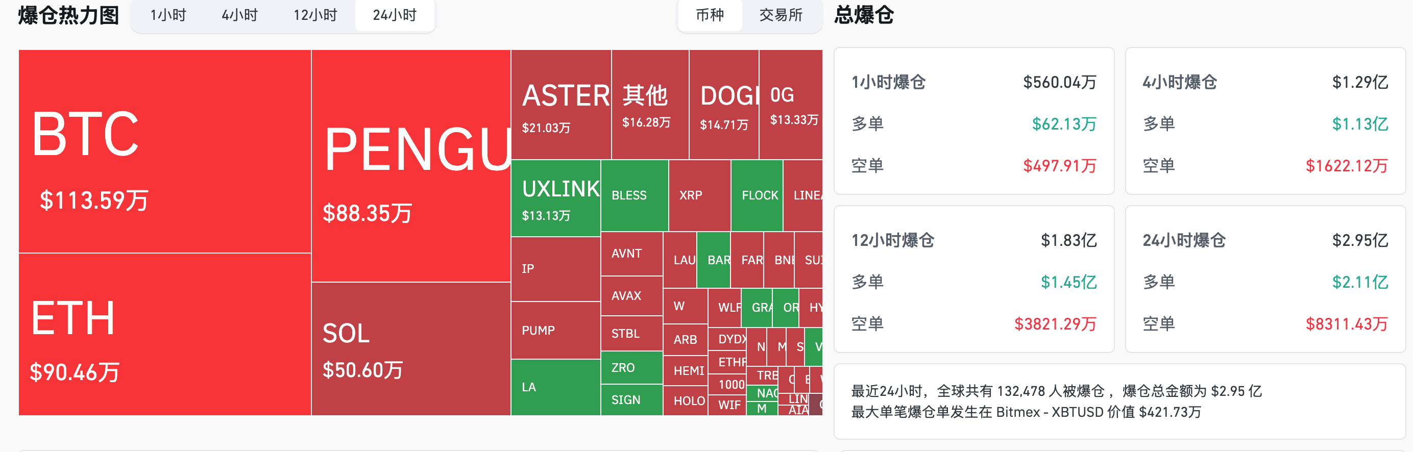 - 24小时爆仓数据:全球共132474人被爆仓 ,爆仓总金额为2.95亿美元,其BTC爆仓113.59万美元、ETH爆仓90.46万美元、SOL爆仓50.6万美元