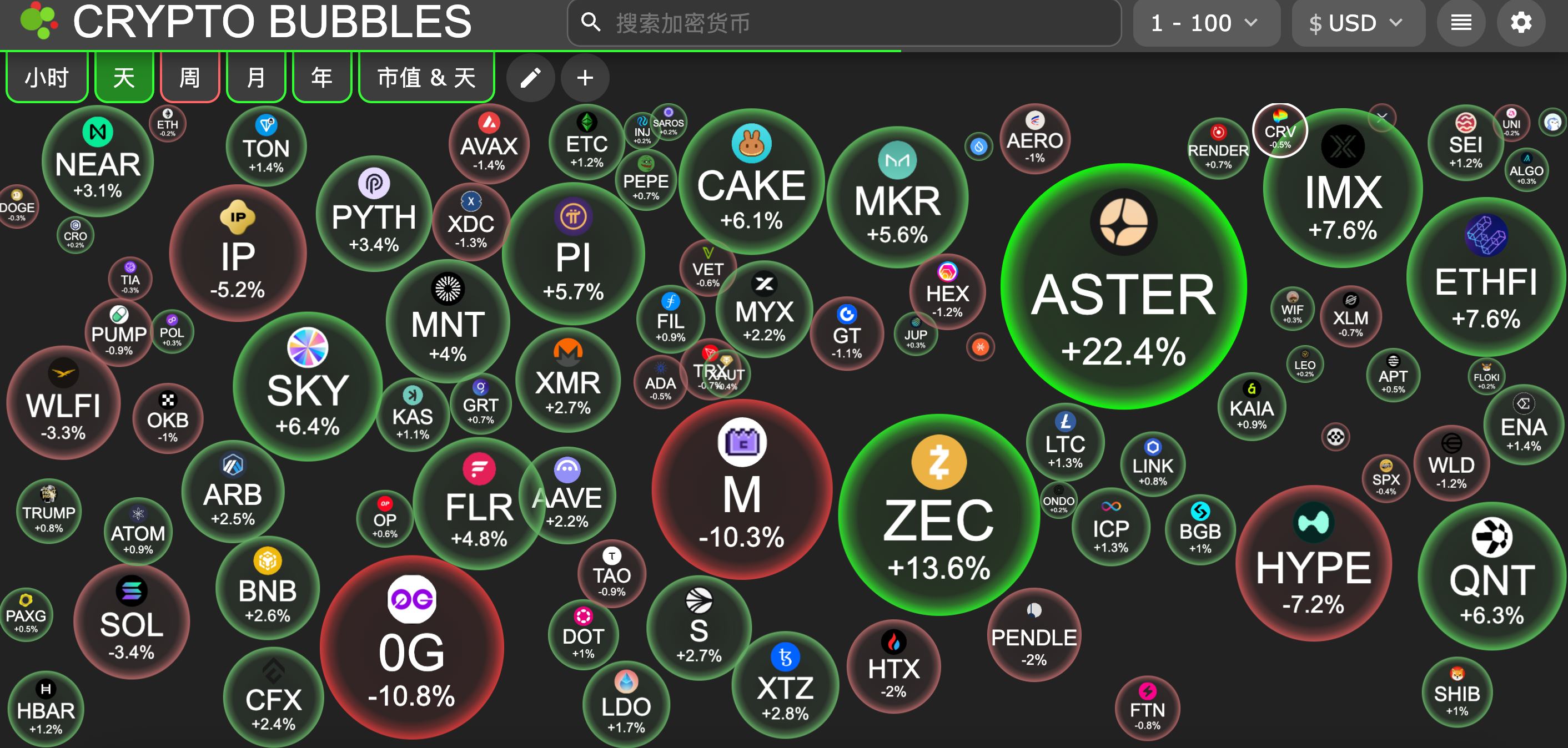 今日市值前100币种最大涨幅:Aster涨22.4%、Zcash涨13.6%、Immutable涨7.3%、Ether.fi涨7.6%、Sky(原Maker)涨6.4%。