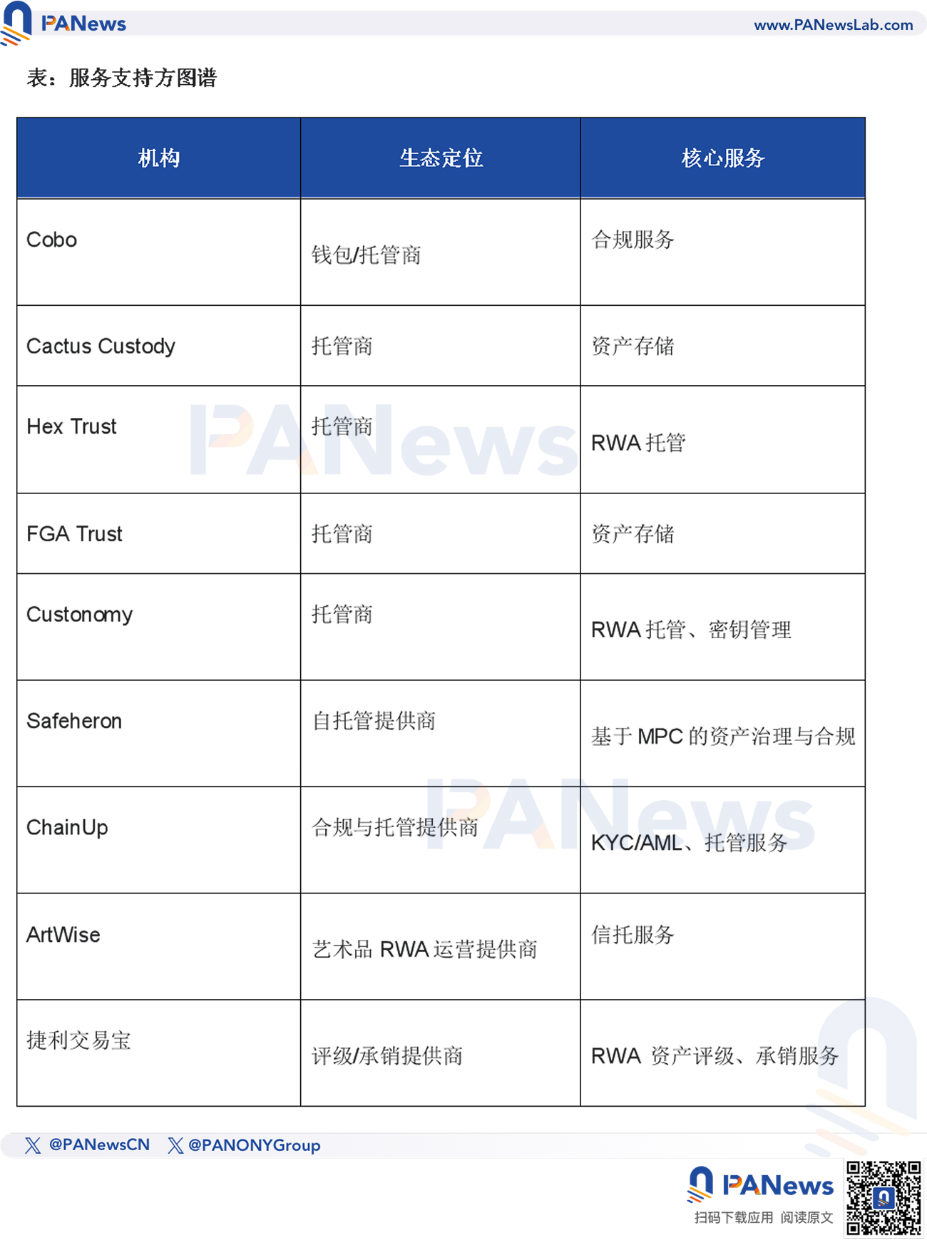 RWA产业包括两大主体,分别是产品发行方与业务支持方。其中,业务支持方可再划分出三大生态位:为资产提供流通交易和价格发现的“流动性提供方”;负责构建底层基础设施与技术架构的“技术支持方”;提供合规、托管及安全保障的“服务支持方”。