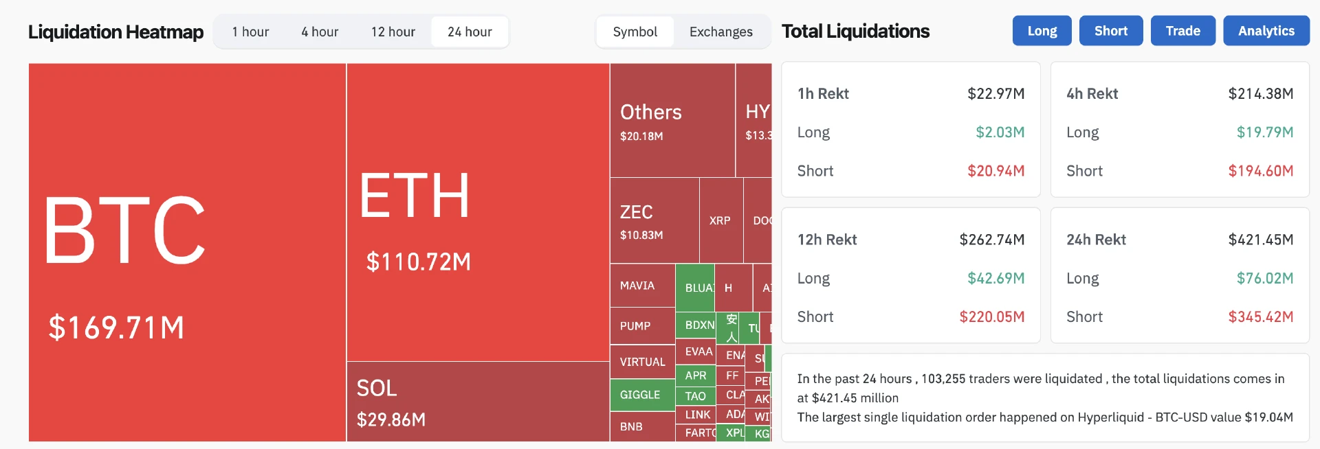 衍生品交易方面,Coinglass数据显示,过去 24 小时全网爆仓 4.21 亿美元,其中绝大部分为空单爆仓,数额达 3.45 亿美元。从币种来看,其中 BTC 爆仓 1.697 亿美元,ETH 爆仓 1.107 亿美元。