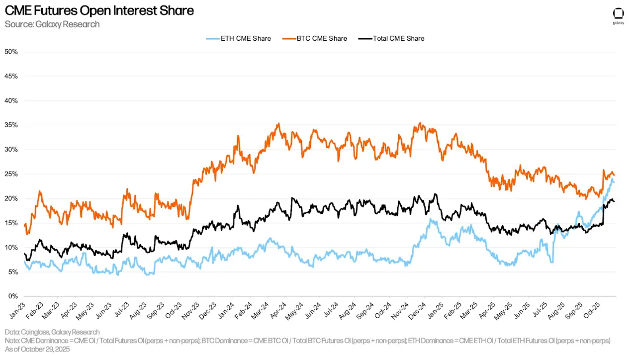 截至 9 月 30 日,芝加哥商品交易所(CME)的未平仓合约份额(包括永续合约和非永续合约)为 14.4%,较上一季度下降 109 个基点。截至 9 月 30 日,CME 在以太坊未平仓合约总量中的份额(计算方式为 CME 以太坊未平仓合约除以市场未平仓合约总量)为 17.28%(较上一季度上升 651 个基点);而截至 9 月 30 日,CME 在比特币未平仓合约总量中的份额为 20.78%(较上一季度下降 554 个基点)。10 月 10 日的杠杆解除使 CME 期货未平仓合约份额在一夜之间从 14.78% 上升 398 个基点至 18.76%。