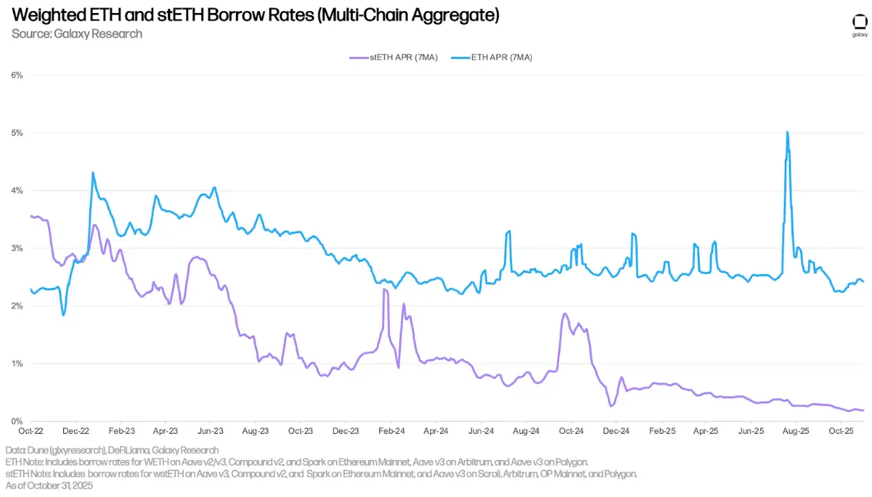 与 WBTC 类似,stETH 的借贷成本通常较低,因为该资产主要用作抵押品,用途不多。