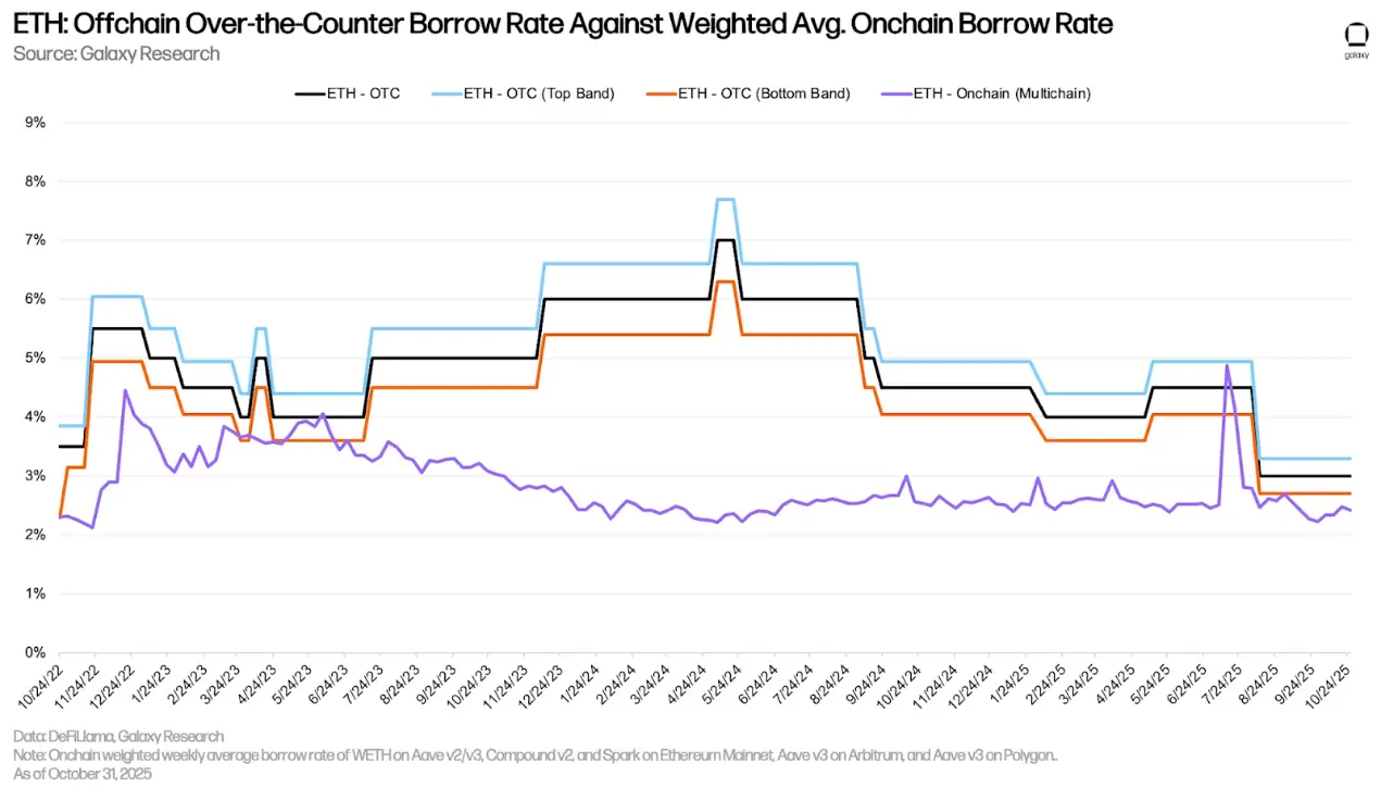 与比特币一样,通过链上借贷应用程序借入以太坊明显比场外交易借入更便宜。这由两个因素驱动:1)与比特币一样,场外交易中有来自卖空者的大量需求,而在链上则不常见;2)以太坊的质押年利率成为场外交易借贷的最低利率,因为几乎没有激励供应商将资产存入场外交易场所,或者场外交易场所以低于质押年利率的利率借出资产。因此,对于以太坊而言,场外交易借贷的最低利率通常是质押年利率,而在链上,质押年利率通常是上限利率,由套利者维持。