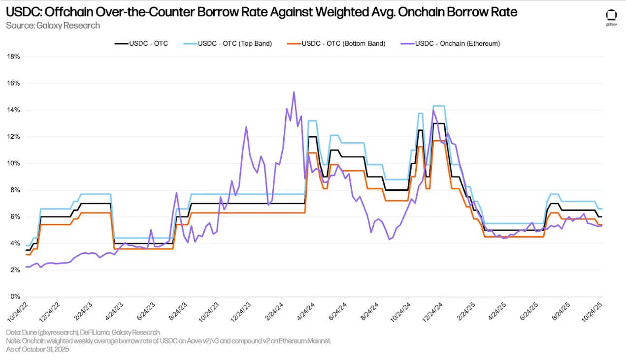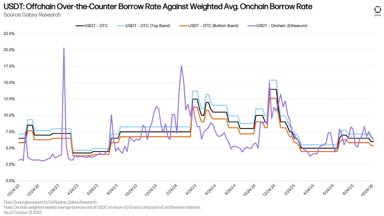 下图追踪的是与上图相同的利率,但针对的是 USDT 借贷。USDT 的链上利率比 USDC 更接近场外交易中间价。