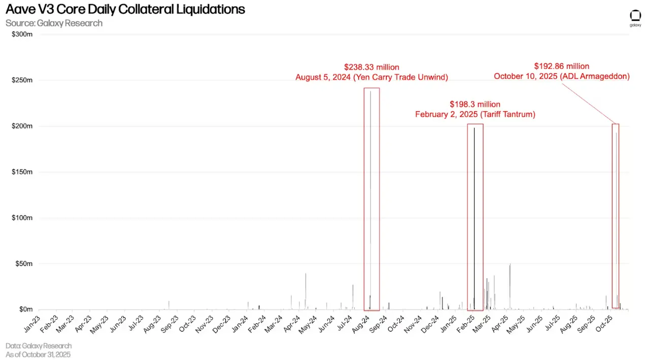 然而,第三季度结束后不久,期货市场经历了有史以来规模最大的清算事件。仅在 10 月 10 日(北京时间10月11日)这一天,价值超 190 亿美元的永续合约头寸被清算,还有数十亿美元的头寸因自动去杠杆化(ADL)而被平仓。尽管这次事件清除了大量的未平仓合约,但它与加密货币抵押借贷不同,未必表明存在系统性的过度杠杆化。价格下跌如此之快,以至于即使是适度杠杆化的头寸也被强制平仓,许多健康的账户也因交易所层面的风险控制而被卷入了连锁清算和 ADL 中。永续合约市场被清仓,但主要是由于机制设计和价格的大幅下跌,而非普遍的借贷过剩。
