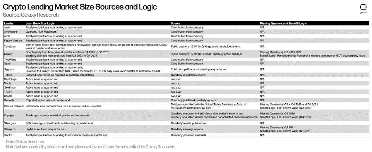 下表详细说明了 Galaxy Research 关于每个 CeFi 借贷机构的数据来源以及用于计算其贷款规模的逻辑。虽然 DeFi 和链上 CeFi 借贷数据可以从链上数据中获取,这些数据透明且易于访问,但获取 CeFi 数据却颇具难度。这是由于 CeFi 借贷机构在记录未偿还贷款的方式以及公布信息的频率方面存在差异,而且获取此类信息本身也存在难度。