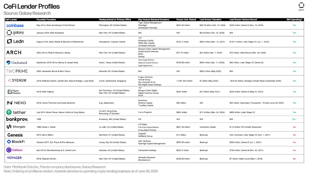 下表对比了市场分析中的 CeFi 加密借贷公司。其中一些公司为投资者提供多种服务。例如,Coinbase 主要作为交易所运营,但也通过场外加密货币贷款和保证金融资向投资者提供信贷。不过,该分析仅显示了其加密货币抵押贷款业务的规模。