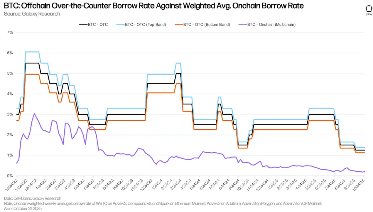 以下对比了稳定币、比特币和以太坊在链上借贷市场和链下渠道的借贷利率。