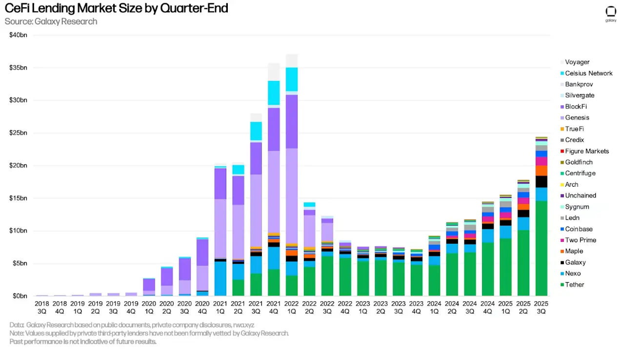 Galaxy Research 跟踪的按未偿还贷款价值排名前三的贷款机构是 Tether、Nexo 和 Galaxy。截至 9 月 30 日,Tether 的未偿还贷款为 146 亿美元,Nexo 为 20.4 亿美元,Galaxy 为 18 亿美元。
