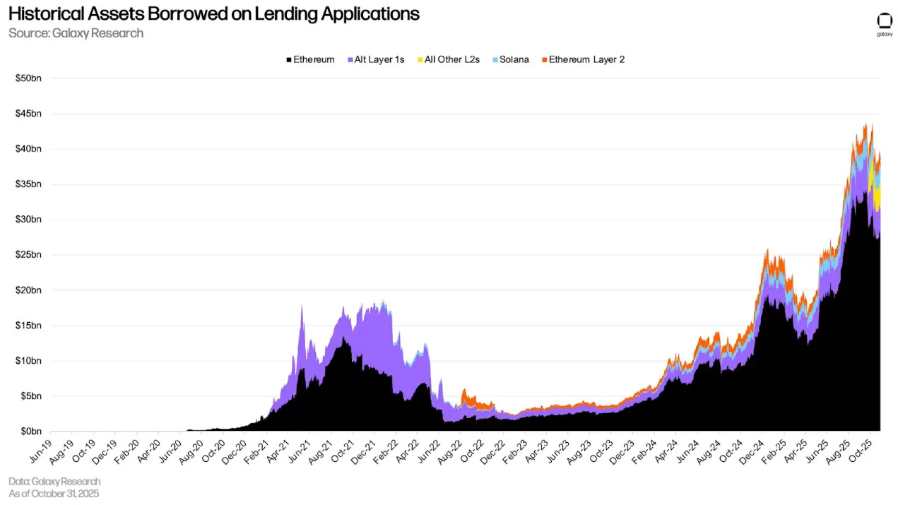 2025 年第三季度,未偿贷款、期货未平仓合约和 DAT 债务均创下新高,但杠杆的构成与以往周期有所不同。增长主要由有抵押的链上借贷和 CeFi 借贷推动,而非无担保信贷和高度投机性策略。