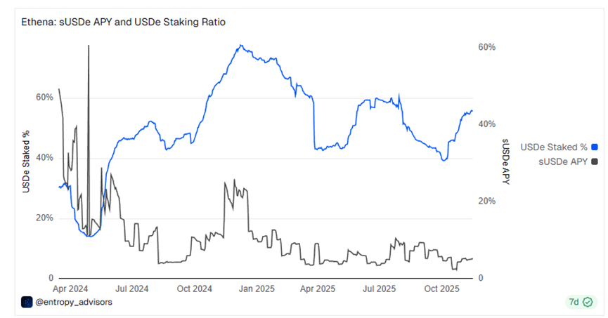 即便Ethena在今年Q3 创下了1.51 亿美元费用捕获的最高纪录,但事实上还是无法抵挡由于收益率大幅下跌导致的市场信心缺失。目前USDe的收益率虽然已经回升到5%以上,但总体的供应量和交易量都处于下滑状态。