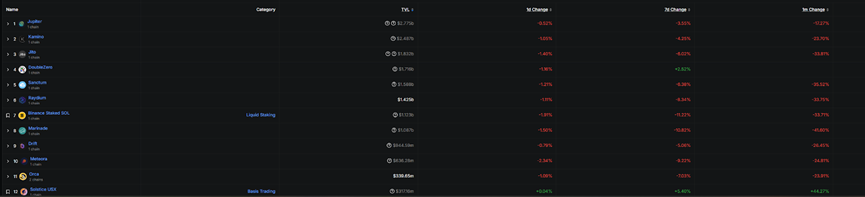 同期,Solana链上的TVL也从129亿美元降至了87.9亿美元,降幅与USDC的供应量相似。而Solana排名靠前的DeFi协议在这一阶段同样经历了TVL的大幅下降。从这一角度来看,在10月11日市场暴跌之后,Solana链上有大批资金选择将稳定币直接赎回以规避市场风险。