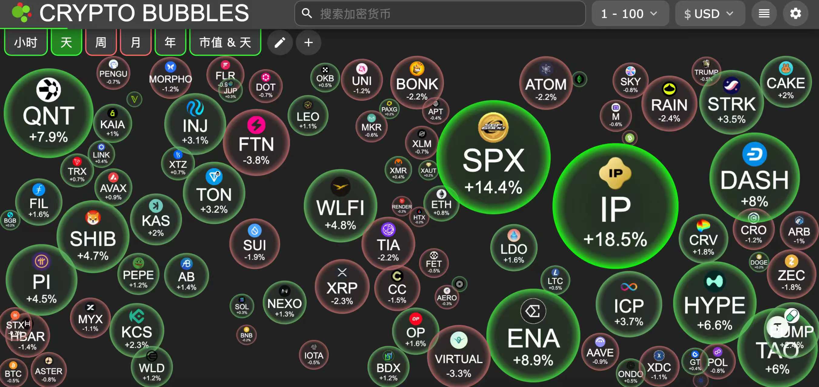 今日市值前100币种最大涨幅:Story涨18.5%、SPX6900涨14.4%、Ethena涨9%、Quant涨7.9%、Dash涨7.5%。