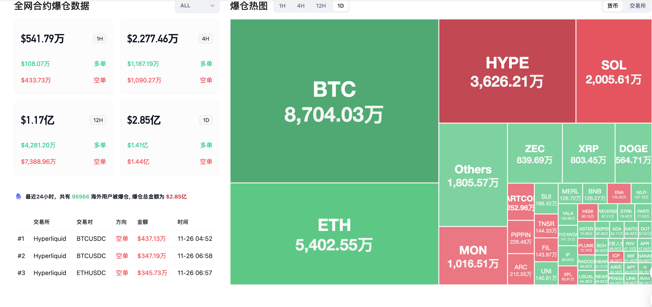 - 24小时爆仓数据:全球共96966人被爆仓 ,爆仓总金额为2.85亿美元,其BTC爆仓8704万美元、ETH爆仓5402万美元、HYPE爆仓3263万美元