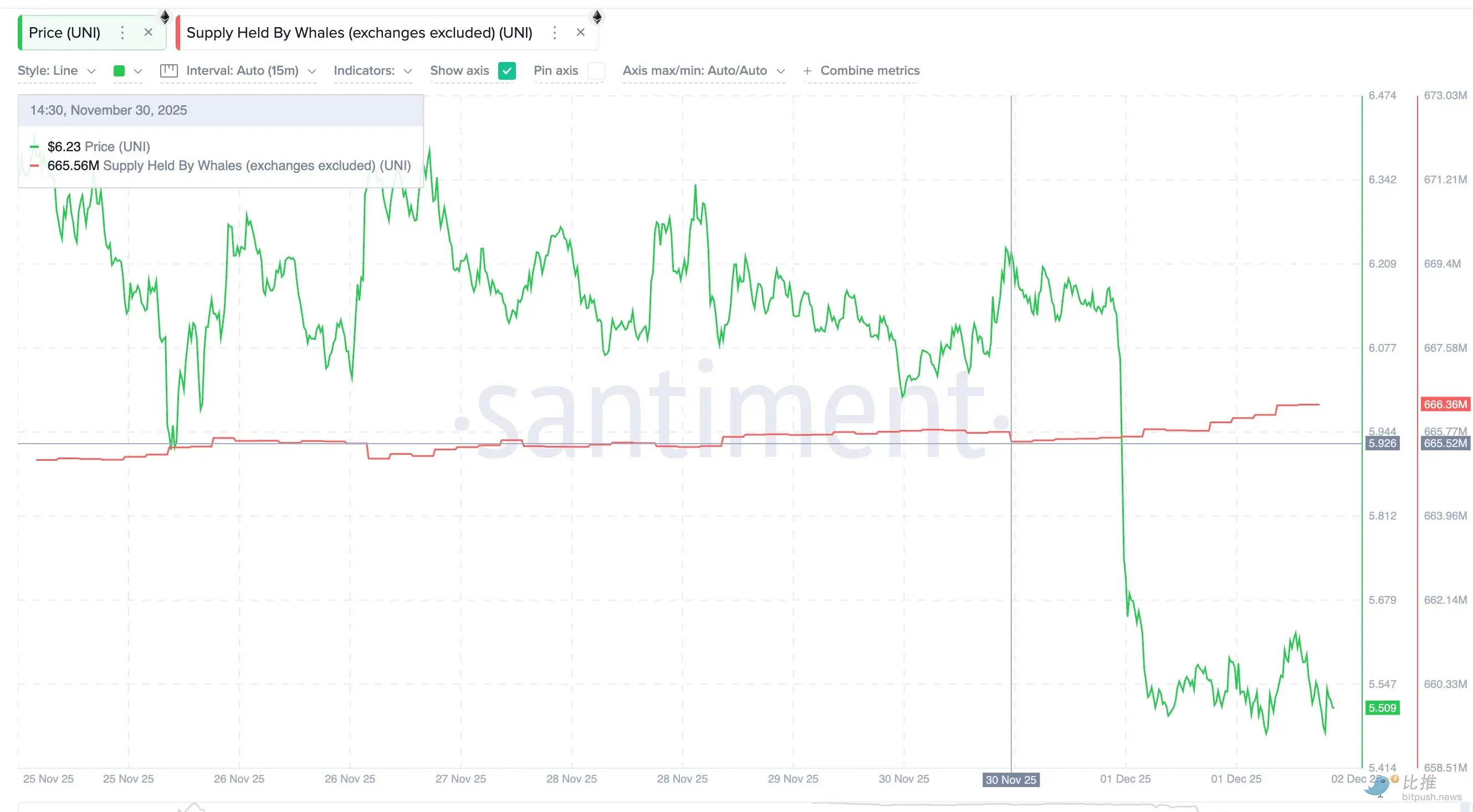 UNI: 过去一周巨鲸新增约80万枚(价值近$500万美金),费用开关投票通过后,排名前 100 的地址共持有 898 万枚 UNI,显示出强劲的吸筹势头,而交易所的供应量却在持续减少。