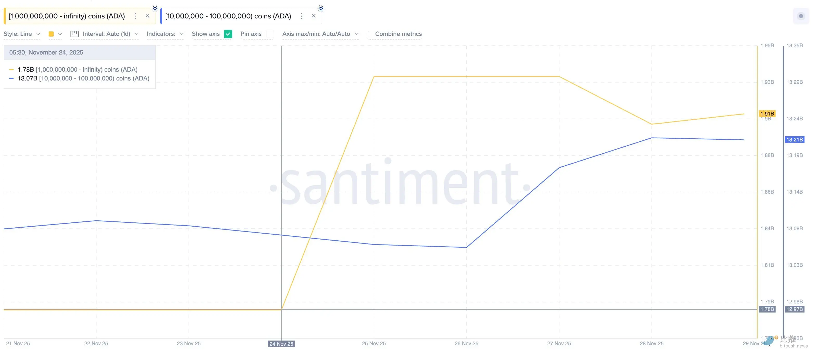 - 持有量在1000万至1亿枚之间的钱包则于11月26日开始增持,增持量为1.5亿枚ADA;