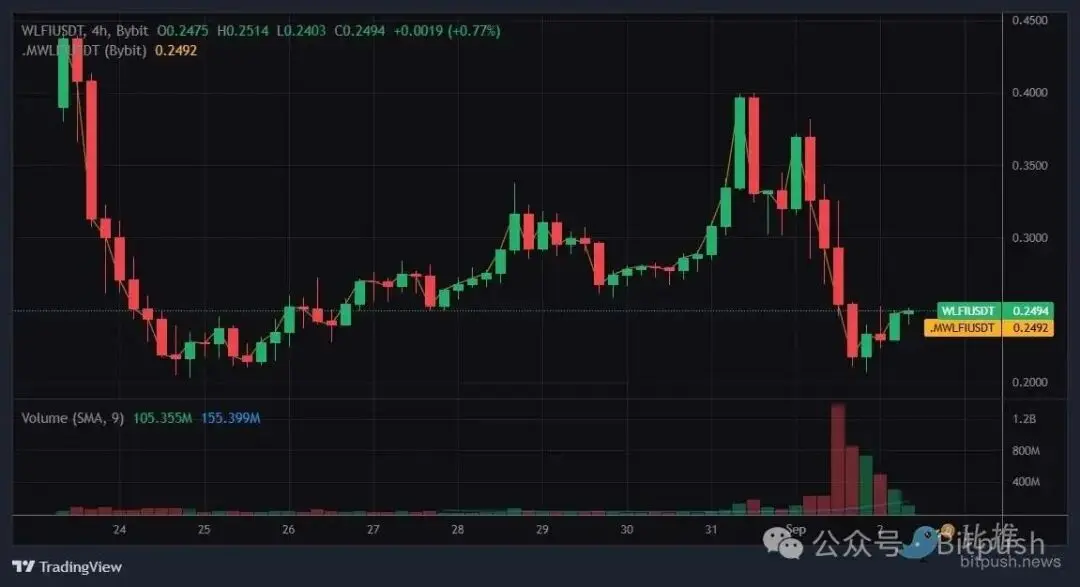 就在 ABTC 上市前几天,特朗普家族的另一加密赌注World Liberty Financial(WLFI) 上线交易。其代币 WLFI 短期冲高至 0.46 美元,但随即暴跌约 50%,收于 0.22 美元左右。