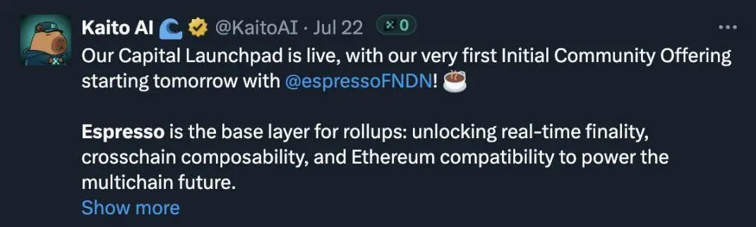 7 月 22 日,Kaito 的 「Capital Launchpad」正式上线,首个上线项目是 Espresso,随后有更多项目陆续入驻。
