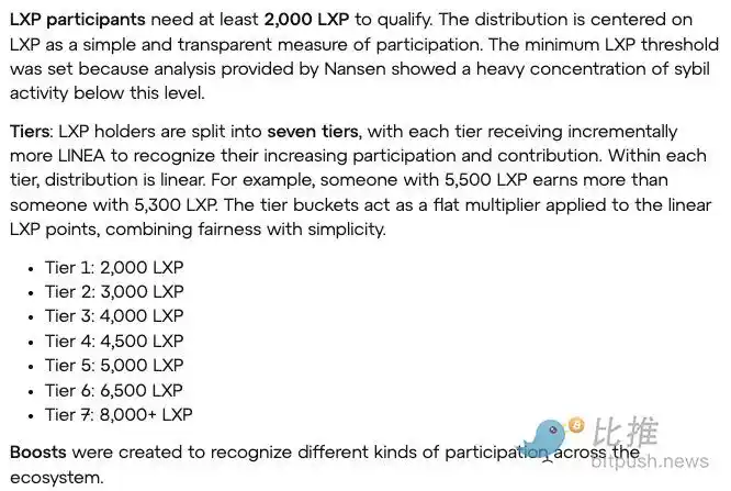 空投资格基于 LXP 和 LXP-L 积分,最低门槛为 2,000 LXP(分 7 个等级)或 15,000 LXP-L(线性分配),约 50 万个地址符合条件。