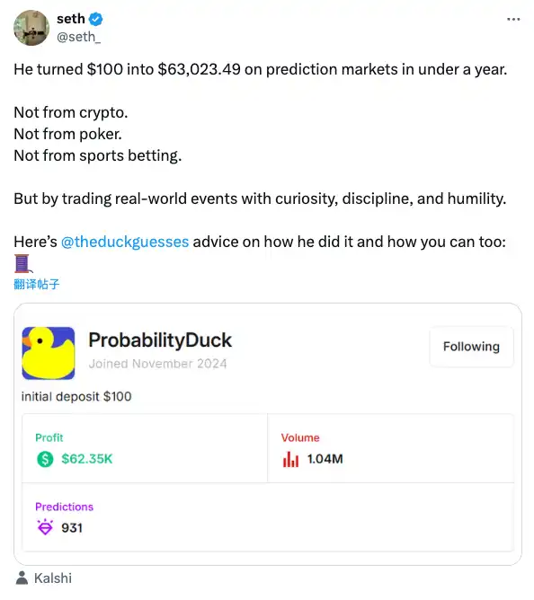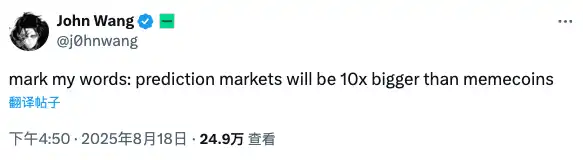 当 Meme 狂潮逐渐退去,Degen 并未收手,而是将热情转移到了预测市场上。如果你常刷 X,可能会经常看到一些所谓的「人物传」,他们通常会讲述一个人怎么用很少的钱赚到超高的倍数,这类故事的背景以前是 Memecoins 或者 DeFi 的套利,现如今换成了预测市场。