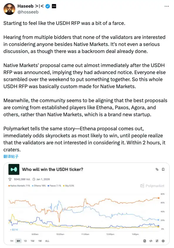 dragonfly 的合伙人 Hasseb 就 USDH 的讨论中引用了 Polymarket 的预测观点值得注意的是,资本市场也在追逐这一新风口。去年以来,多家预测市场平台获得大额融资,估值迅速攀升。Kalshi 在赢得官司后不久即宣布完成 1 亿美元融资,投后估值达到 10 亿美元级别。Polymarket 也在 2025 年初筹集了 2 亿美元资金,使其估值升至约 20 亿美元。
