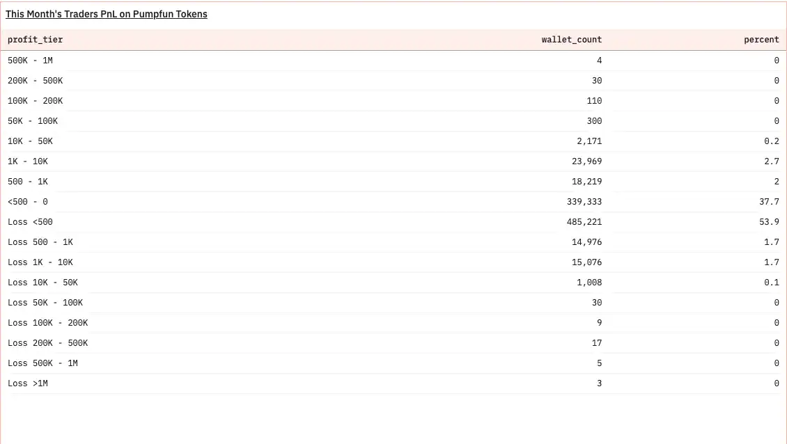 参与 pumpfun 玩家的赚钱与损失比例,此前 (亏损:赚钱) 的比例在 7:3 上下浮动,而现在达到了 6:4,但赚钱和亏钱的范围几乎集中在了+—500 美元,Memecoins 的财富效应正在消失,源:DUNE共识导致价格不稳、资金避而远之,反过来又让市值难以做大。这种「击鼓传花」式的博弈游戏随着财富效应的消退正变得越发冷清。