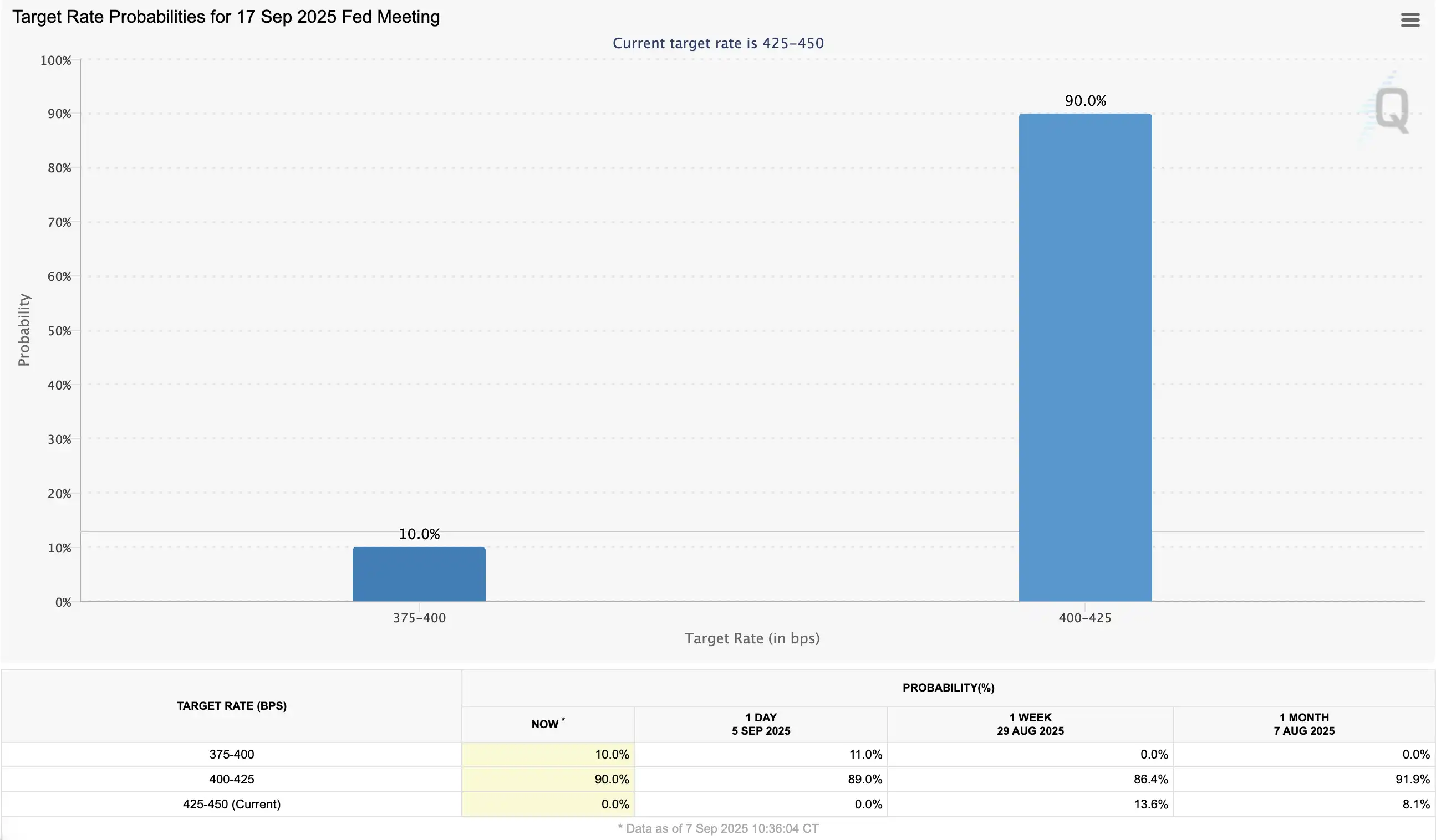 9 月 5 日,美国劳工部公布的 8 月非农就业数据再次令市场失望——新增就业仅 2.2 万人,远低于预估的 7.5 万人。至此,非农已连续四个月疲软,8 月也将过去四个月的平均新增就业数拉低至仅 2.7 万。疲弱数据直接推动市场对美联储政策路径的重新定价:9 月、10 月和 12 月连续降息的预期全面升温,据 CME 数据显示,美联储降息概率从公布前的 86.4% 飙升至 100%,其中 90% 押注 25 个基点,10% 甚至押注 50 个基点。
