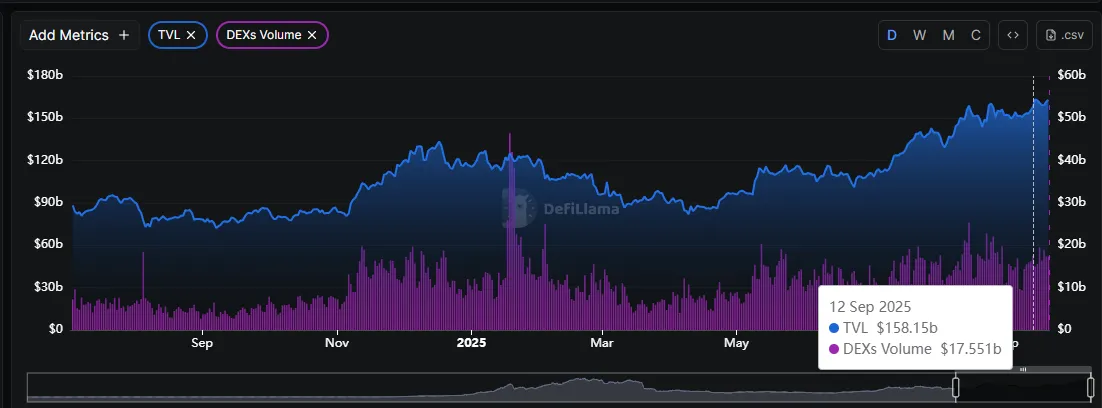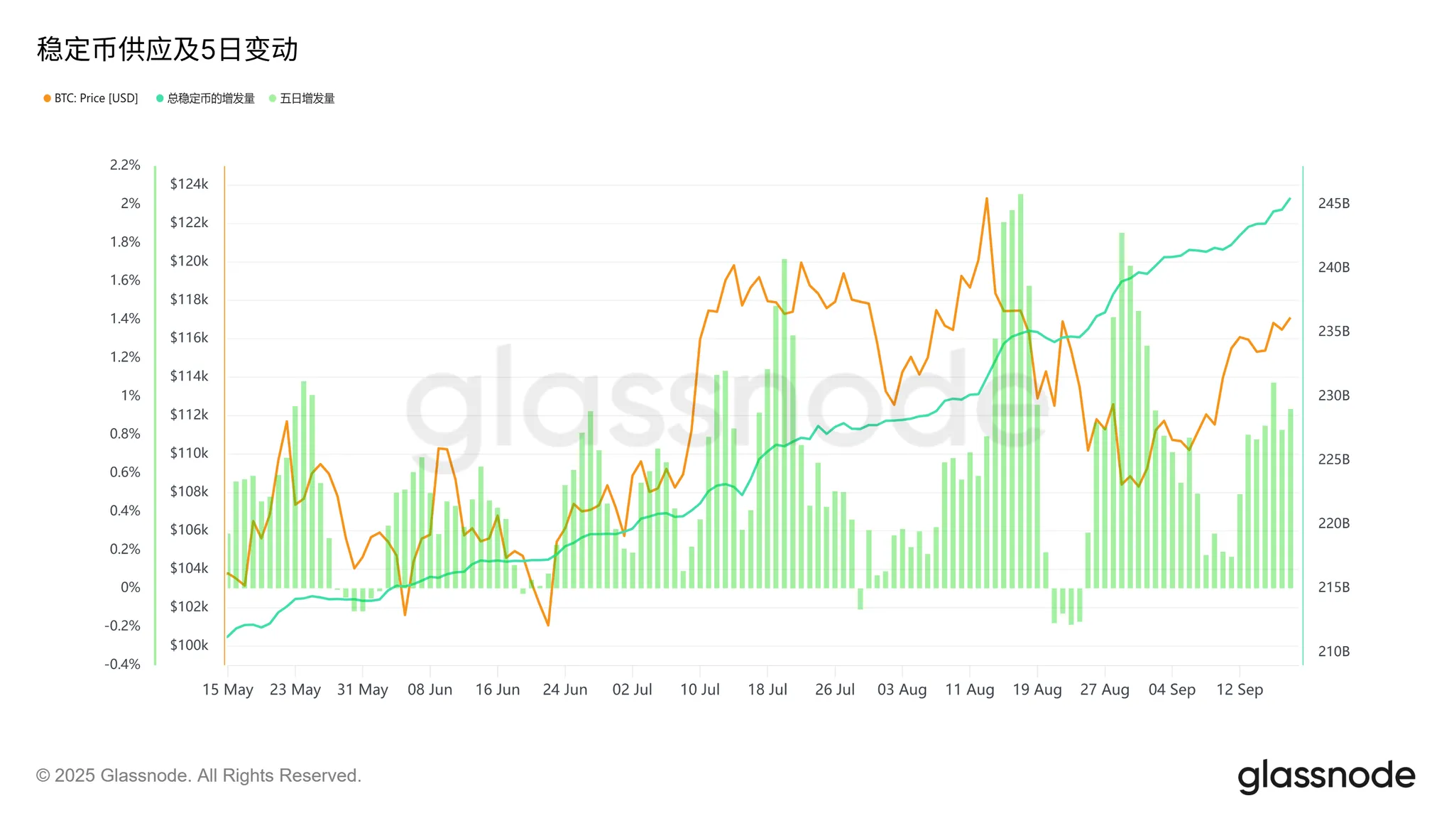 本周稳定币增发总量来到了2455.04亿美元,单周增发量相较于上周来说从9.36亿美元上升到了36.57亿美元,出现了明显的回温,日均增发也从1.34亿美元上升到了5.22亿美元,整体增发水平相比上周环比+290%。结合大盘来说,虽然大盘在本周前半段议息会议开始之前整体情绪偏向于观望避险走出了一定的调整,但在议息会议明确降息之后,再伴随着本周稳定币持续高增发的背景市场还是在本周后半段走出了进一步的上涨。