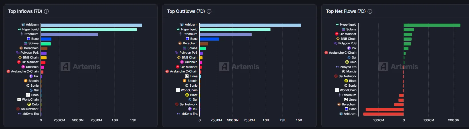 本周链上DeFi 桥接资产流向方面,净流入最多是hyperliquid链,净流出最多arb链,后续值得持续关注。
