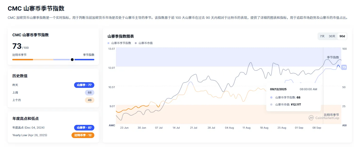 山寨指数:本周五山寨指数73,较上周小幅上升,想比较主流币btc表现较好。