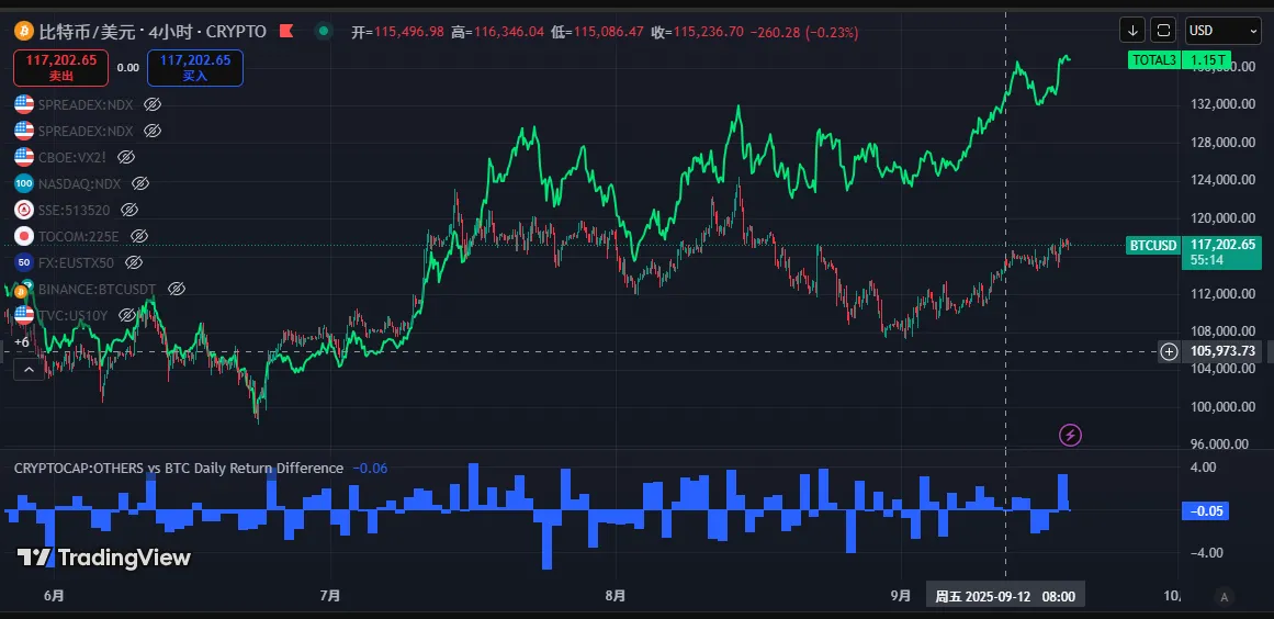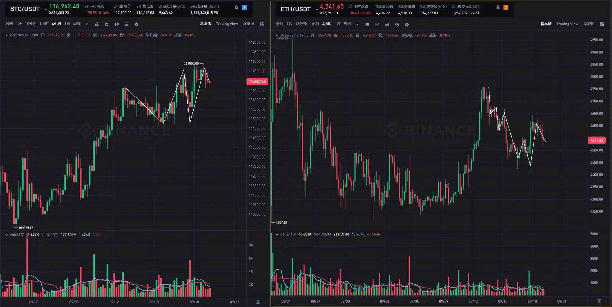 上周我们提到过周三周四是杀不动震荡上行的走势,在周五周六的时候,市场震荡上行转为了一波小流畅的上涨,我们之前提到过,这里的上涨属于跌不动的反弹,后面的上涨的技术面的不确定性比较强,所以也可以看到后面BTC、ETH的技术走势并不相同,BTC走了一个横盘,但是ETH走了多波段的震荡回落,ETH跌回了上涨的一半的走势,其实有技术面破坏性的可能。另外一点是本周18号的凌晨两点美联储的议息会议,在这之前市场的横盘,其实也有市场在等消息的逻辑,在18号降息之后,山寨市场出现明显上冲,不过ETH和BTC变动的相对幅度并不大(SOL出现单日6%的幅度)。