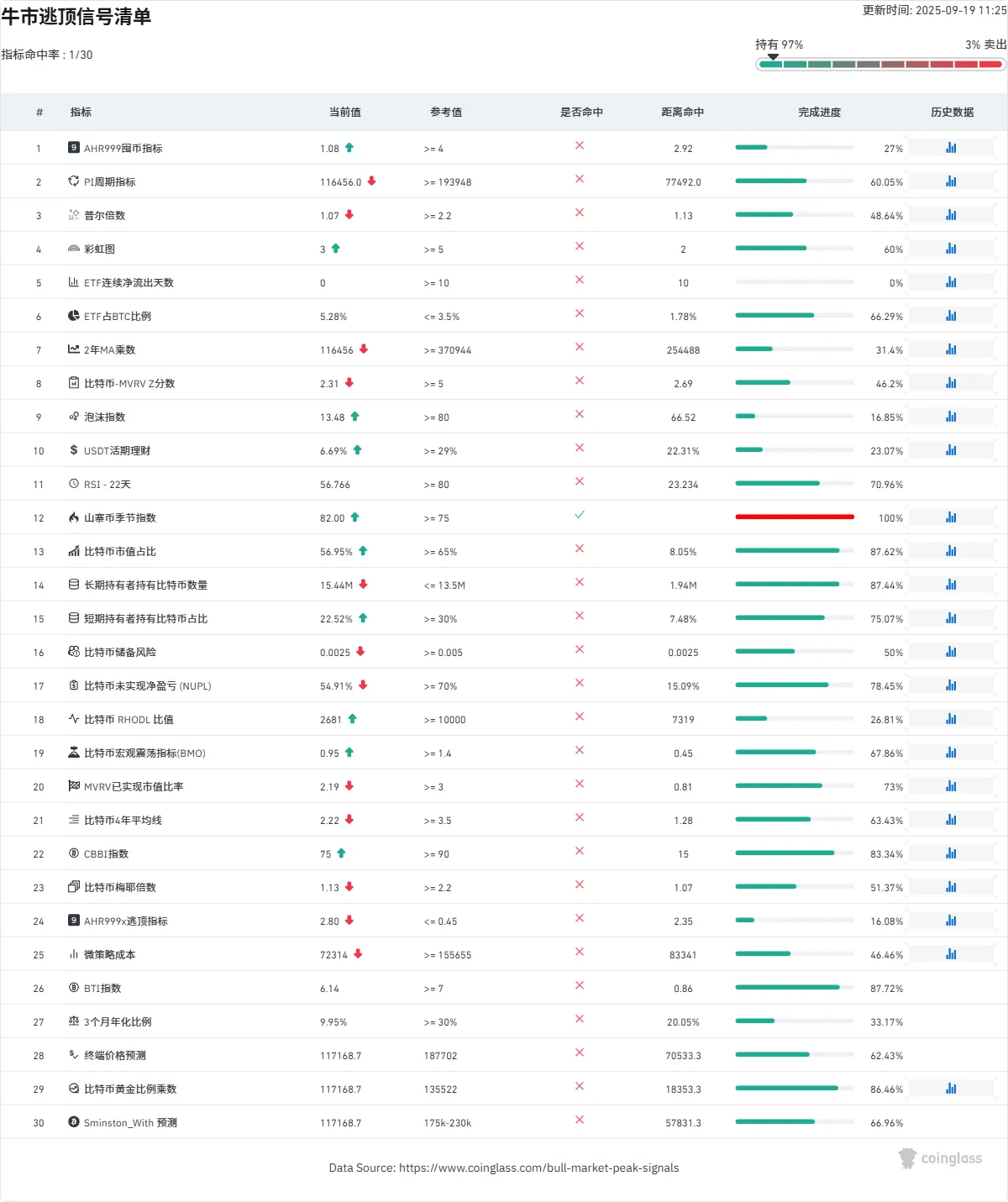 逃顶指标:逃顶合集方面本周:山寨币季节指数依旧显示见顶出现,其它指标未出现。本周依旧表现出的市场分化,整体上赚钱效应较好,低位普遍上涨,但是涨幅较大的下跌。