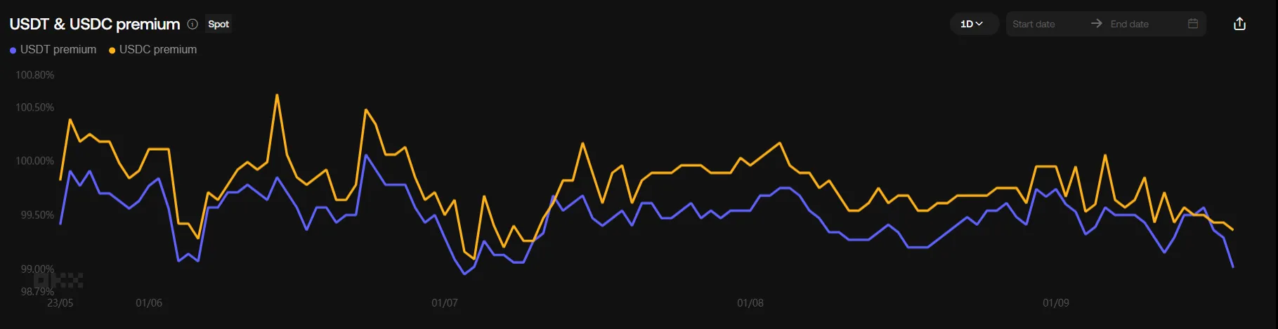 本周usdt和usdc的场外折溢价整体处于一个下降的走势,可以看出在本周议息会议之前市场情绪处于一个保守和观望的态度,即使在本周前半段大盘出现了一定程度的回落调整时,仍没有激发场外资金的进出抄底意愿,同时在议席会议之后,大盘反弹的过程中依旧没有激发场外资金进场追涨的fomo情绪,整体还是一个相对冷静的观望态度。