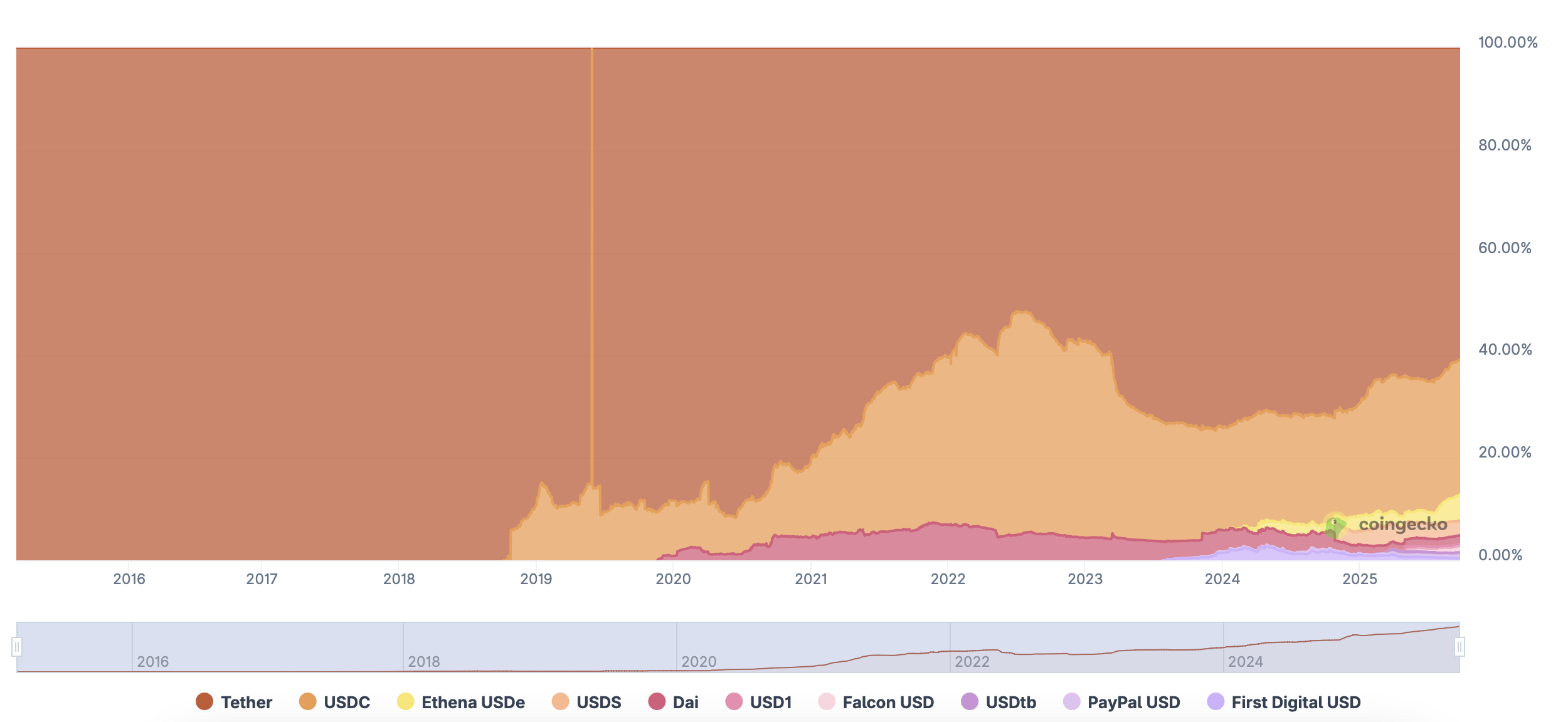 Tether身价的飞速攀升,离不开其市场份额优势、惊人的利润率及稳健的财务状况。据CoinGecko数据显示,截至9月24日,USDT市值突破1720亿美元,续创新高,占据市场超过六成份额。与此同时,据Tether CEO Paolo Ardoino最近坦言,Tether的利润率高达99%。二季度财报进一步显示,Tether财务稳健,储备资产达1625亿美元,超过1571亿美元的负债。