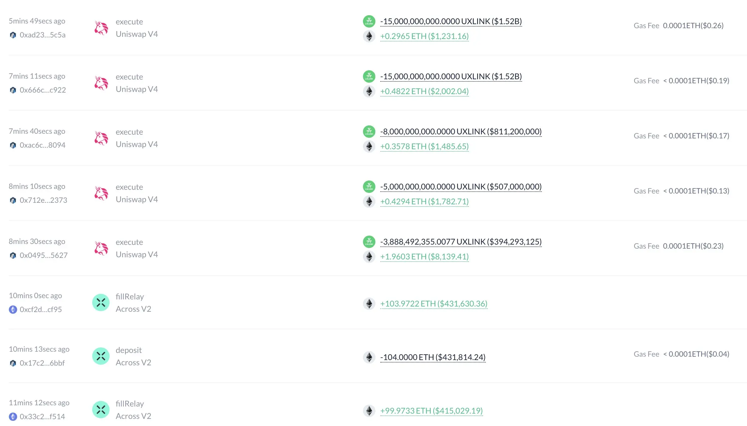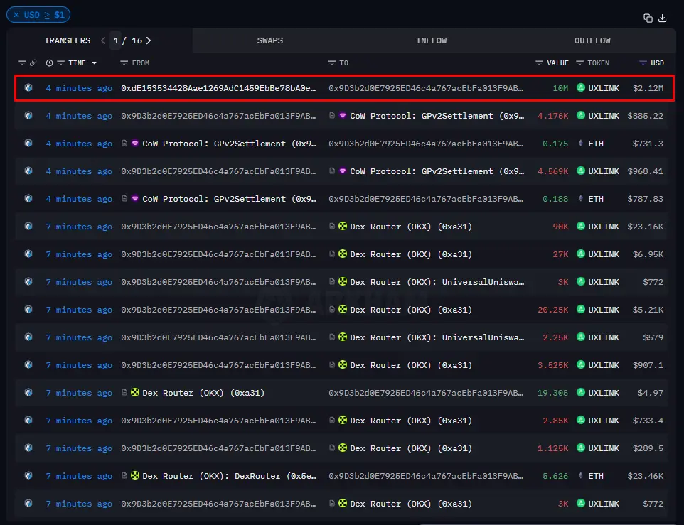 据 Lookonchain 监测,攻击者并未止步于“账面增发”。他将大批 UXLINK 转入多个地址后,在 DEX 上迅速清算,累计获得了 6732 枚 ETH(约 2810 万美元),并疑似将部分资金转入 CEX 准备进一步提现。