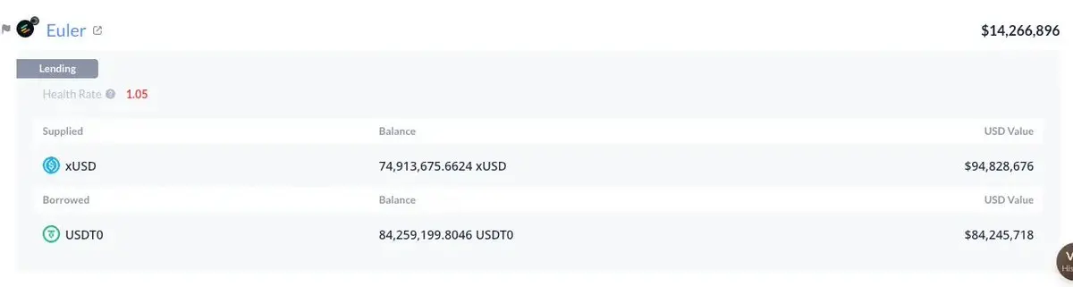 协议本身在这些市场中存在显著风险敞口,其中最大的一笔为在 Plasma 上以 xUSD 抵押借出的 8400 万美元 USDT。
