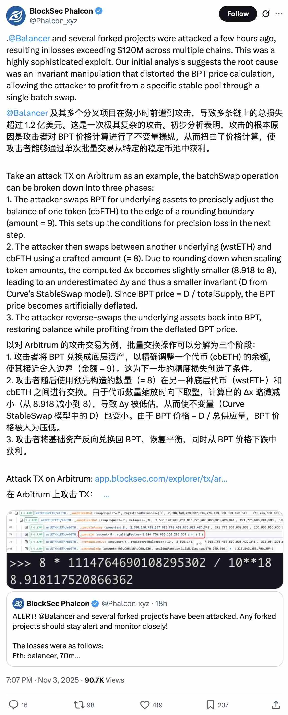 Balancer v2 漏洞在多个链上爆发,且在相当长的一段时间内,哪些资金池受到影响、哪些网络或集成协议直接暴露风险尚不清楚。