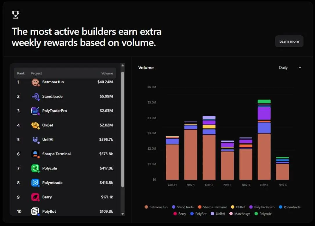 图:超过5000万美元的投注量通过第三方Polymarket应用完成Polymarket似乎在帮助扩大构建者应用的范围,从交易终端到AI助手,并且还创建了类似Hyperliquid的仪表盘,用以展示顶级构建者及其奖励。