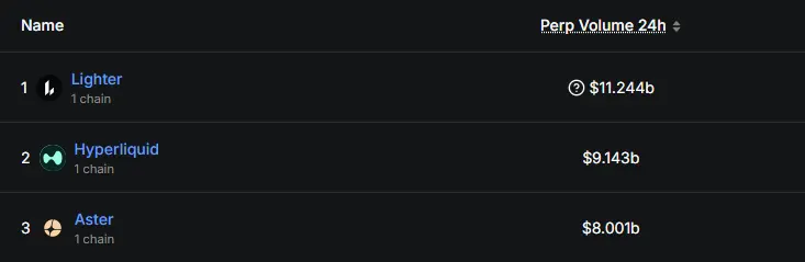 受此消息影响,尚未发币的 Lighter 一时间成为「撸毛党」眼中最值得刷交易量的 Perp DEX 项目。DefiLlama 数据显示,Lighter 24 小时交易量突破 110 亿美元,已位居 Perp DEX 首位,紧跟其后的是 Hyperliquid(91 亿美元)、Aster(80 亿美元)。