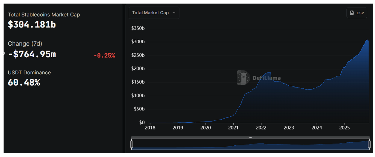 不同于过去几年的反应,这次波动并未演变成系统性危机。USDT 与 USDC 的核心流动性池保持稳定,机构资金并未撤离,跨境支付与企业结算也未受到实质影响。即便在事件发生之后,稳定币总市值仍稳定在三千亿美元上方,价值流动的规模持续增长。