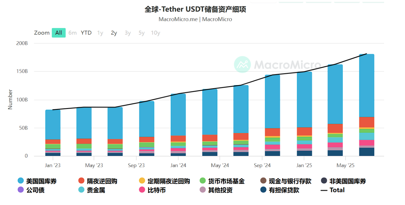 数据来源:MacroMicro USDT为了更具代表性地观察行业现状,我们以市场占比最高的 Tether 作为参考。根据 MacroMicro 的最新储备披露,美国国债在其资产结构中占比超过七成,总规模突破 1350 亿美元。