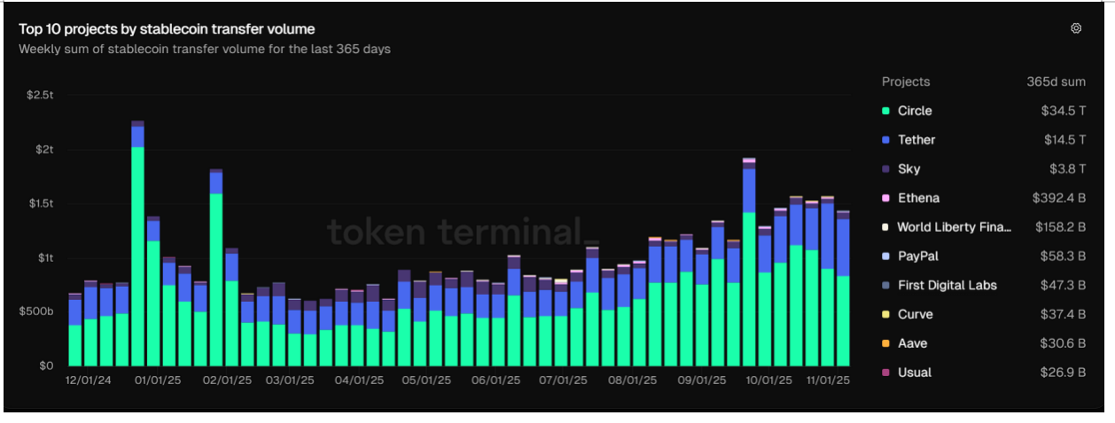 数据来源:TokenTerminalTokenTerminal 的数据进一步揭示了结构性变化:过去一年 Circle 的稳定币转账量高达 34.5 万亿美元,远超其他竞争者,Tether 以 14.5 万亿美元紧随其后。从周度趋势来看,9 月之后链上活动显著抬升,恰好对应监管落地、企业采用加速后的阶段性增长。