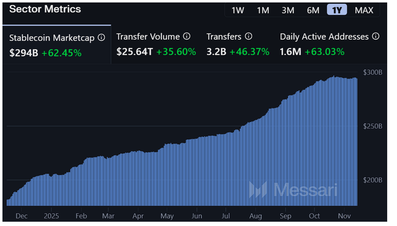 数据来源:Messari Stablecoins链上数据同样展示了稳定币市场的成熟面貌。Messari 的追踪显示,过去一年稳定币链上转移规模超过 25 万亿美元,累计转账笔数突破 32 亿,活跃地址达到 160 万,增幅均在 30%–60% 区间。这些增长并非由投机推动,而是来自跨链清算、交易所结算、企业付款、链上托管与跨境汇款等真实场景——每一类都属于高频、刚需、可持续的价值传递需求。