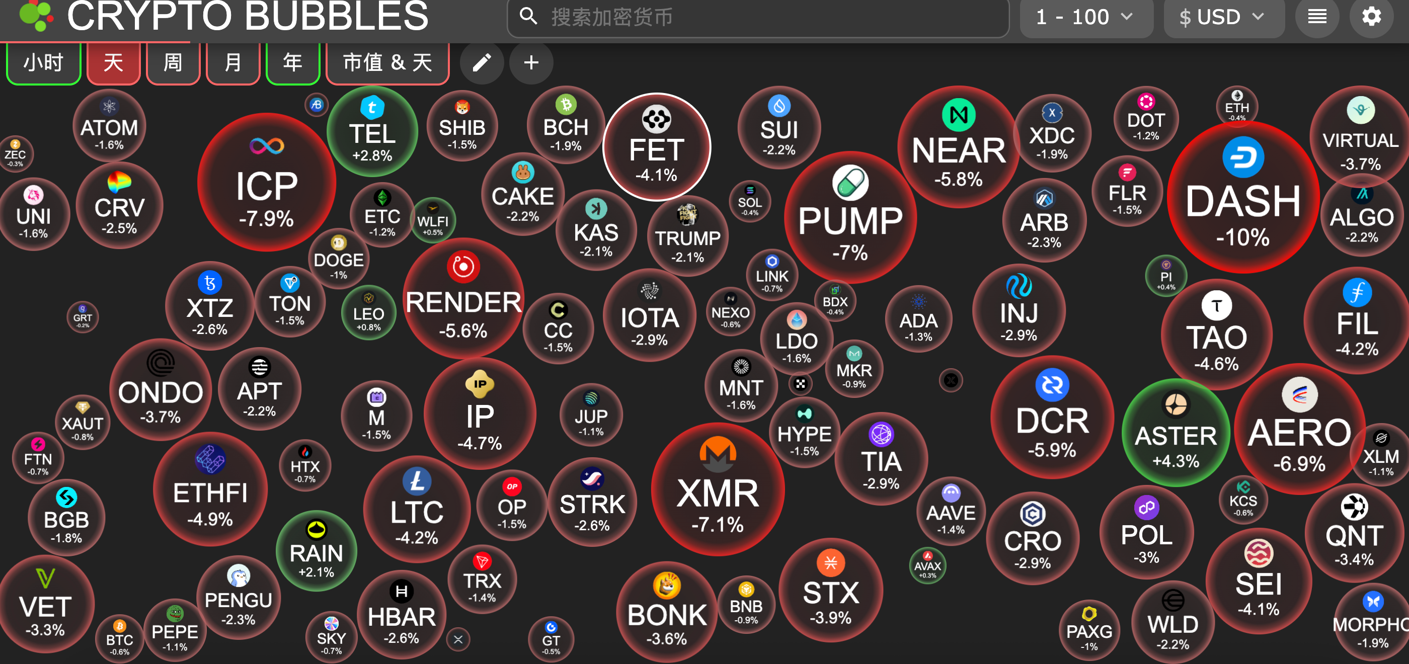 今日市值前100币种最大跌幅:Dash跌10%、Internet Computer跌7.9%、Monero跌7.1%、Pump.fun跌7%、Aerodrome Finance跌6.9%。