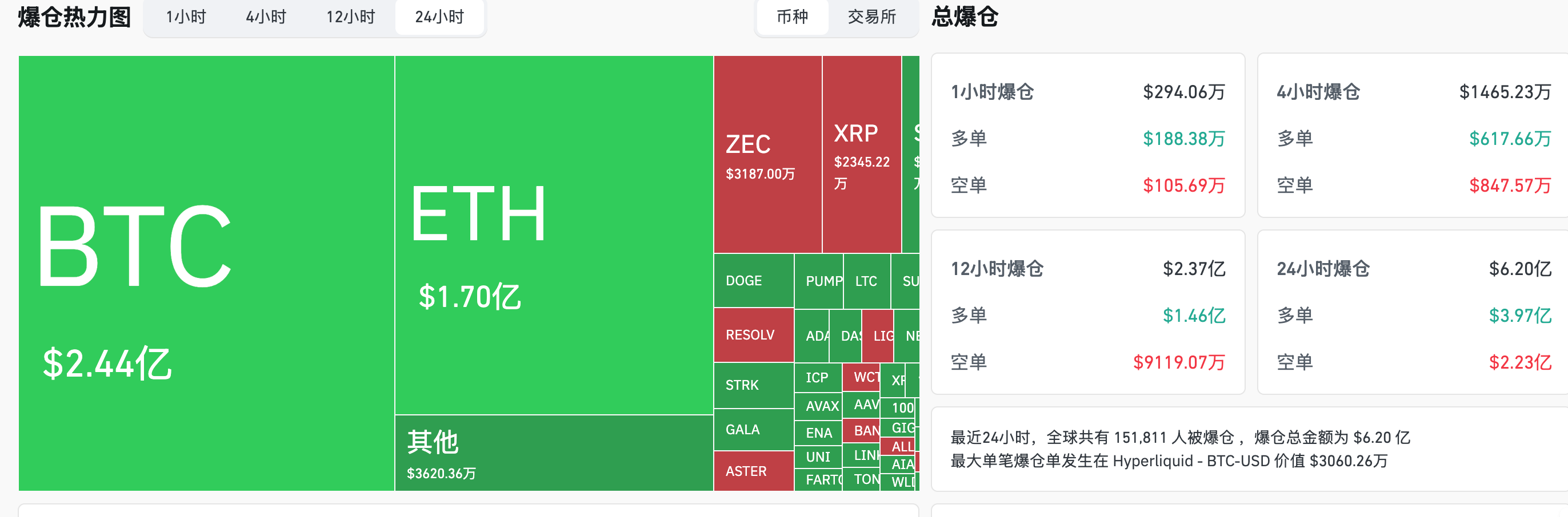 - 24小时爆仓数据:全球共151811人被爆仓 ,爆仓总金额为6.2亿美元,其BTC爆仓2.44亿美元、ETH爆仓1.7亿美元、ZEC爆仓3187万美元