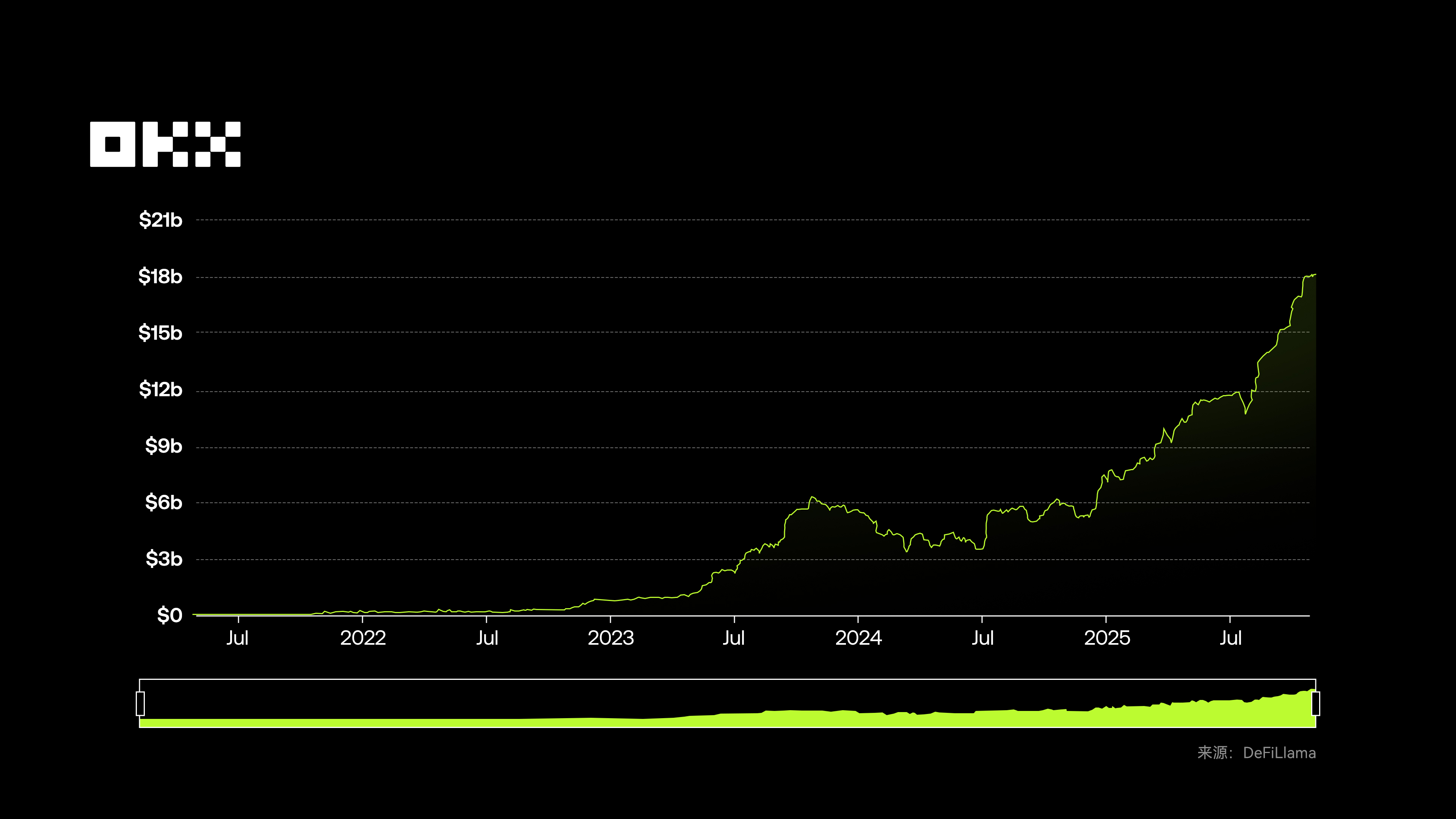 据DeFiLlama数据,全球RWA总锁仓量(TVL)达181.17亿美元,延续增长趋势。(注:链上RWA总额统计的是所有链上发行的相关代币总价值;而TVL特指存放在DeFi协议中作为抵押品或生息资产的RWA价值。很大一部分RWA(如贝莱德的BUIDL)被用户直接持有在钱包里,并未存入DeFi协议,因此TVL会远小于总发行额。)
