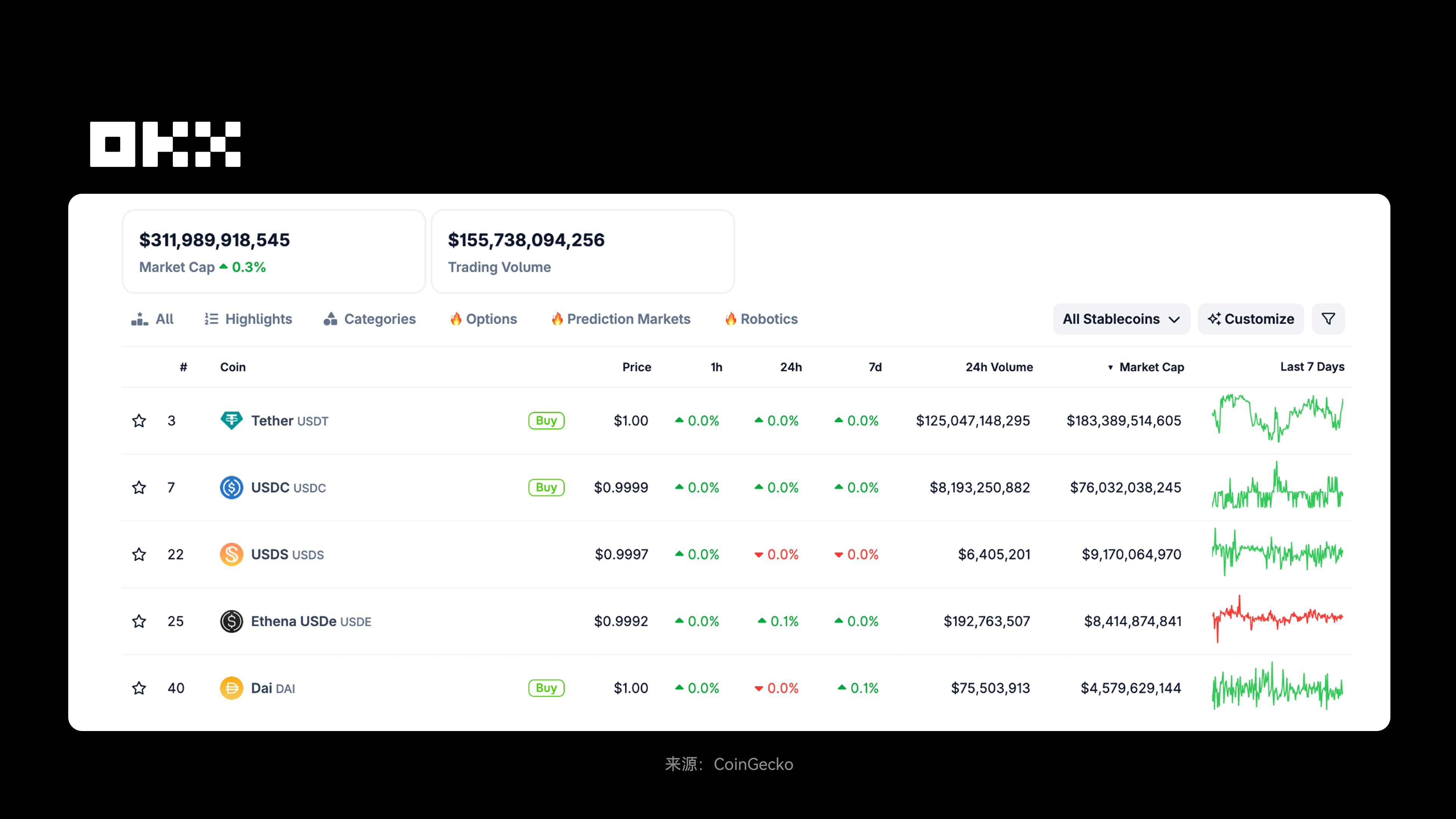 稳定币市场高度集中,USDT 与 USDC 市值占比超80%,以法币抵押、现金及美债储备为主,中心化程度高,主要应用于跨境支付、交易结算和企业薪资等传统场景;而中小型稳定币如 DAI、USDe、sDAI 等采用收益型或超额抵押模式,部分去中心化,依赖链上监控和智能合约,服务 DeFi、链上借贷与资产代币化,风险和波动性较高。总体来看,中心化法币抵押稳定币低风险且透明,创新型稳定币则更强调链上金融功能与自动化收益。
