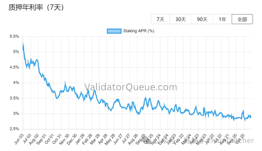 二是质押收益率下降和借贷成本上升,使得杠杆质押无利可图。当前以太坊的年化质押收益率约为2.9% APR,远低于2023年5月创下的8.6%的历史最高纪录。