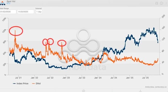 短短六周,比特币市值就蒸发了 5000 亿美元,ETF 资金流出、Coinbase 折价、结构性抛售、仓位不佳的多头头寸被清算,同时也没有明显催化剂刺激市场反弹。不仅如此,巨鲸抛售、亏损严重的做市商、缺乏防御性流动性供应、量子危机带来的生存威胁,这些持续存在的担忧仍然是比特币可能迅速复苏的阻碍。然而在本次下跌过程中,有一个问题始终困扰社区,即:比特币波动性究竟发生了什么?