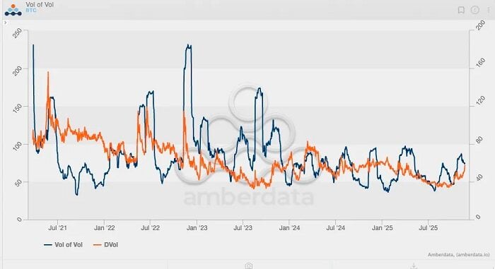 如果观察比特币波动率指数(vol-of-vol index)时会发现更清晰的模式(该指数本质上是波动率的二阶导数,或者说是波动率本身变化速度的体现),历史数据显示,比特币波动率指数的最高值出现在 FTX 崩盘期间,当时该指数飙升至约 230。然而自 2024 年初 ETF 获得监管批准上市以来,比特币波动率指数从未突破 100,隐含波动率也持续走低,与现货价格走势无关。换句话说,比特币仿佛不再出现 ETF 推出前市场结构中标志性的高波动行为。